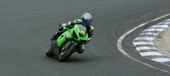 | 最終コーナー立ち上がりでのきたりんとCBR1000RR。「路面がスリッピーなので、スライドを多用してもタイヤが減らないことが良い」と、ひょうひょうと語るきたりんは、実際、この最終コーナーにてスライドを多用して走行していた。 ちなみに、ウェイン・レイニーなどのダートトラック出身のアメリカン・ライダーは、左の開けてくコーナーが得意だが、同じスタイルの流れを組むと思われるきたりんも、左の開けてくコーナーである、この最終コーナーは気分が良かったのではないだろうか? また、いかにも走り込んでいる感じの常連のライダーの皆さんは、最終コーナーのコーナーリングスピードが非常に高かったが、彼らに対して、コーナーリングスピードがそれ程高くないきたりんが、いとも簡単に常連ライダーと互角以上に渡り合えてしまうのは、とりあえずハイパワーなマシンを購入し、立ち上がり重視のスタイルで走った方が、初めてのコースでのタイムアップや、競い合いでのパッシングに有利だという、きたりんの基本的な考えの具現化と言える。 しかし、誤解を避ける為に断っておけば、立ち上がり重視の走りをするライダーだけを持ち上げるのは不公平だというコーナーリングスピード重視のライダーを弁護する能力において、私はその為の遺伝子が不足しているようだ。 |
