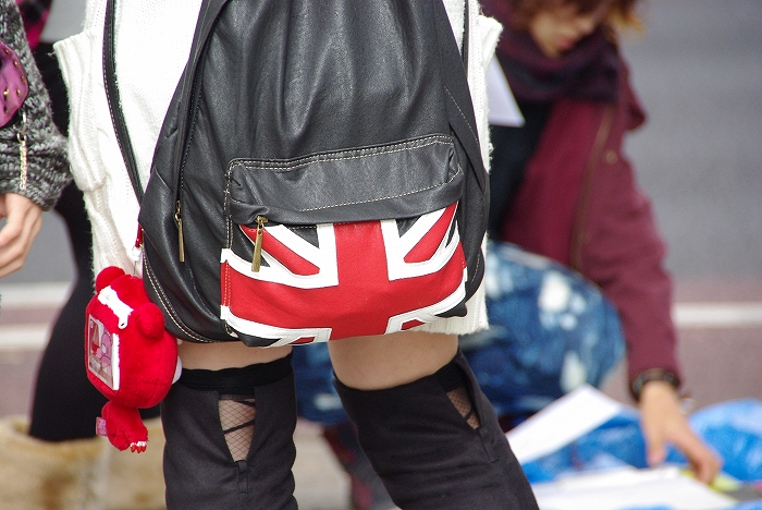 豹柄のスカートを履く&豹っぽい耳を付けた「ドンキホーテ」の袋を持って歩く女性。