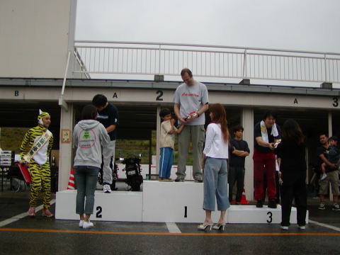 現地調達したレースクィーンの皆さんにメダルをかけてもらっているところ。